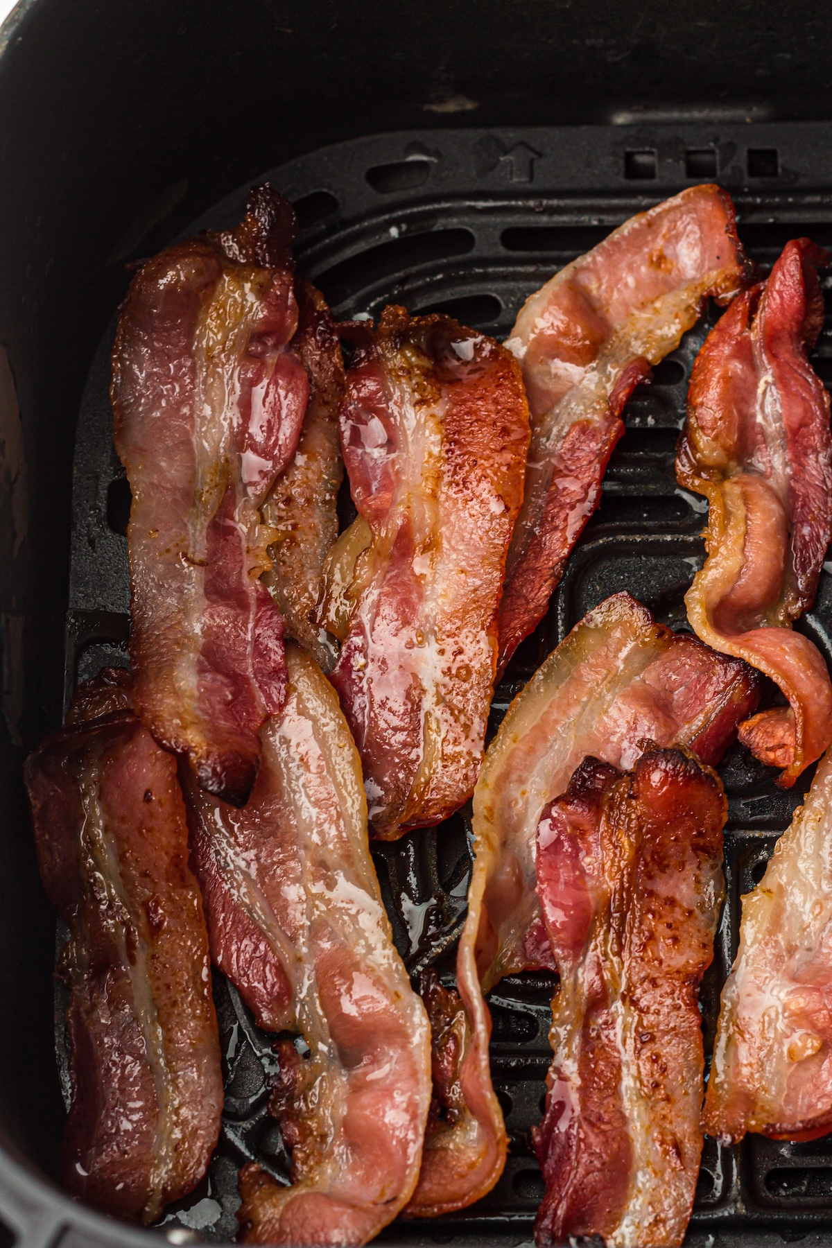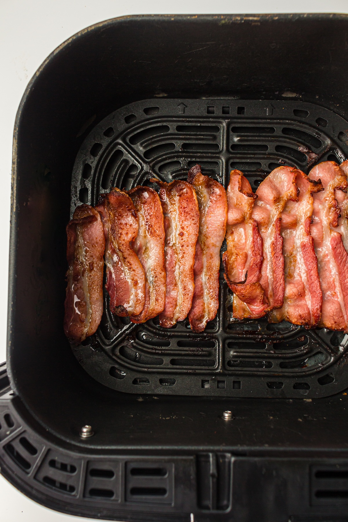 Air fryers are powerful. It can go from “perfect” to “burnt” in less than a minute. Toward the end of the cooking time, check on your bacon frequently. It’s better to pull it out a few seconds early than a few seconds late.