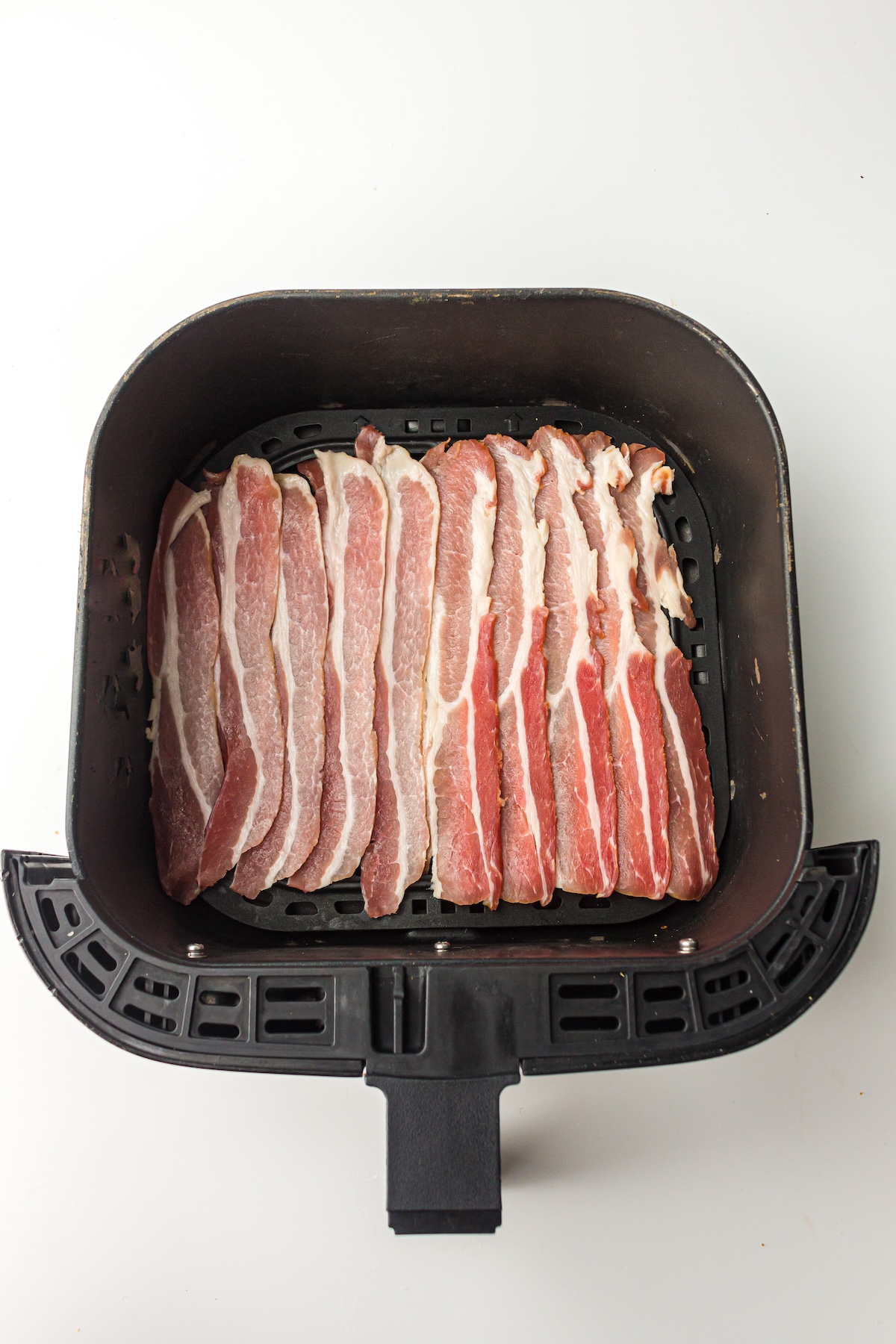 - While the air fryer is preheating, arrange the bacon slices in a single layer on the air fryer basket. You may need to cook the bacon in batches depending on the size of your air fryer.