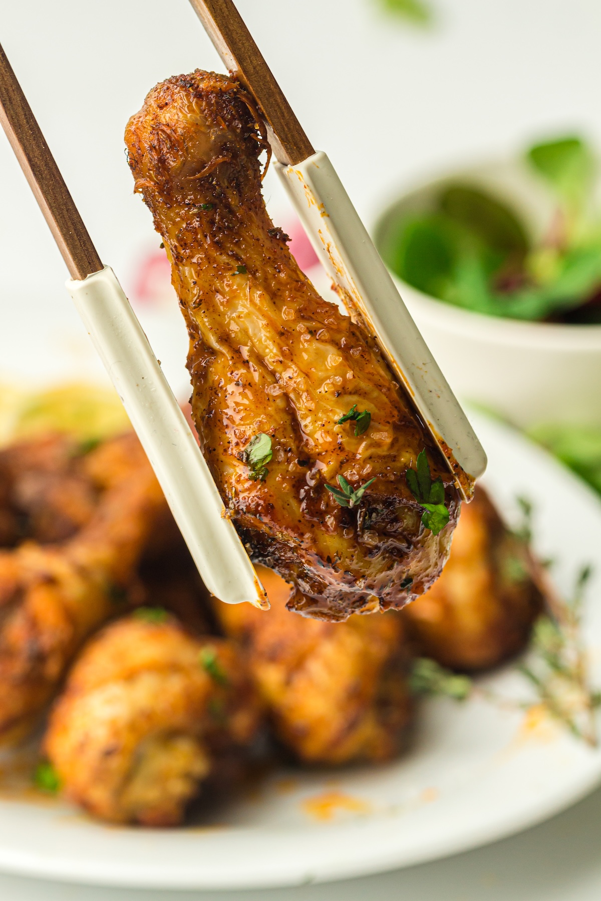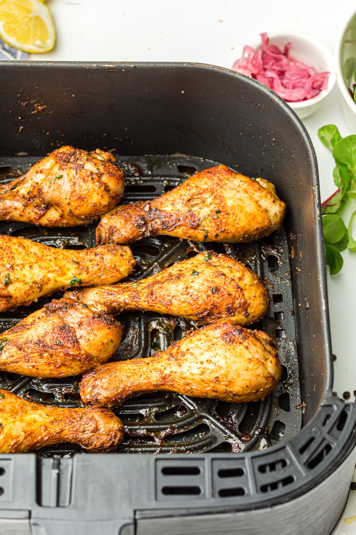 - BBQ Style: Use a dry BBQ rub before cooking, and then brush your favorite BBQ sauce on the drumsticks during the last 2 minutes of air frying. This caramelizes the sauce without burning it.