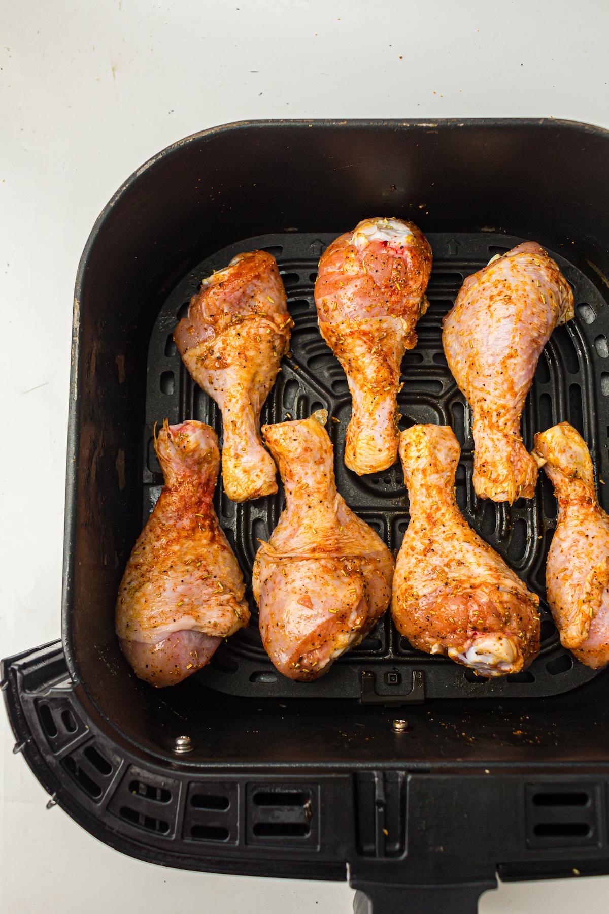 - Place the seasoned chicken drumsticks in the air fryer basket in a single layer, leaving some space between them for even cooking.