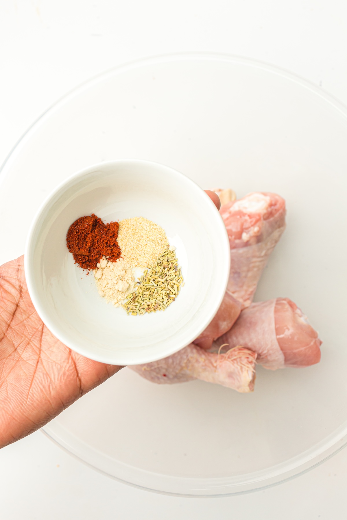- In a large bowl, add salt, pepper, smoked paprika, onion powder, garlic powder, and dried rosemary to the chicken drumsticks.