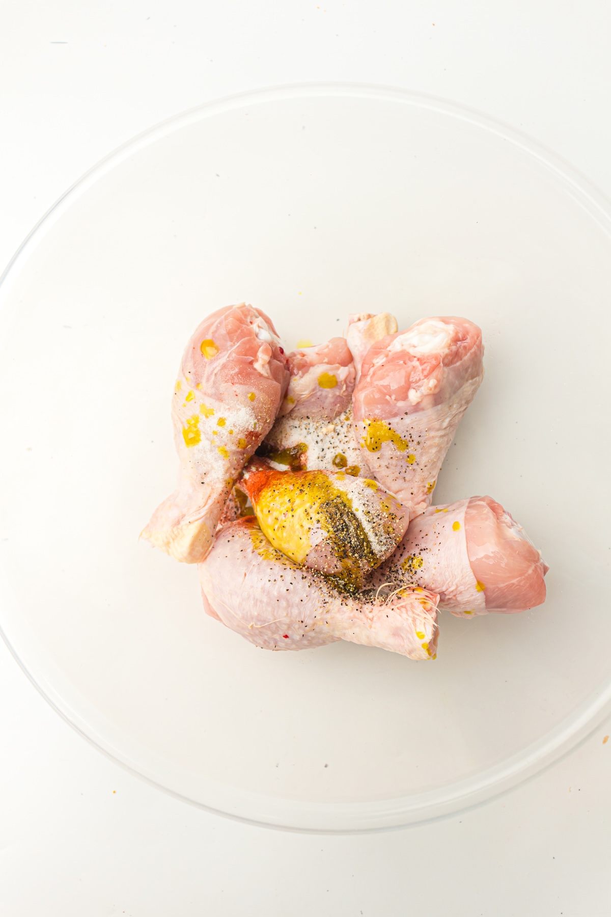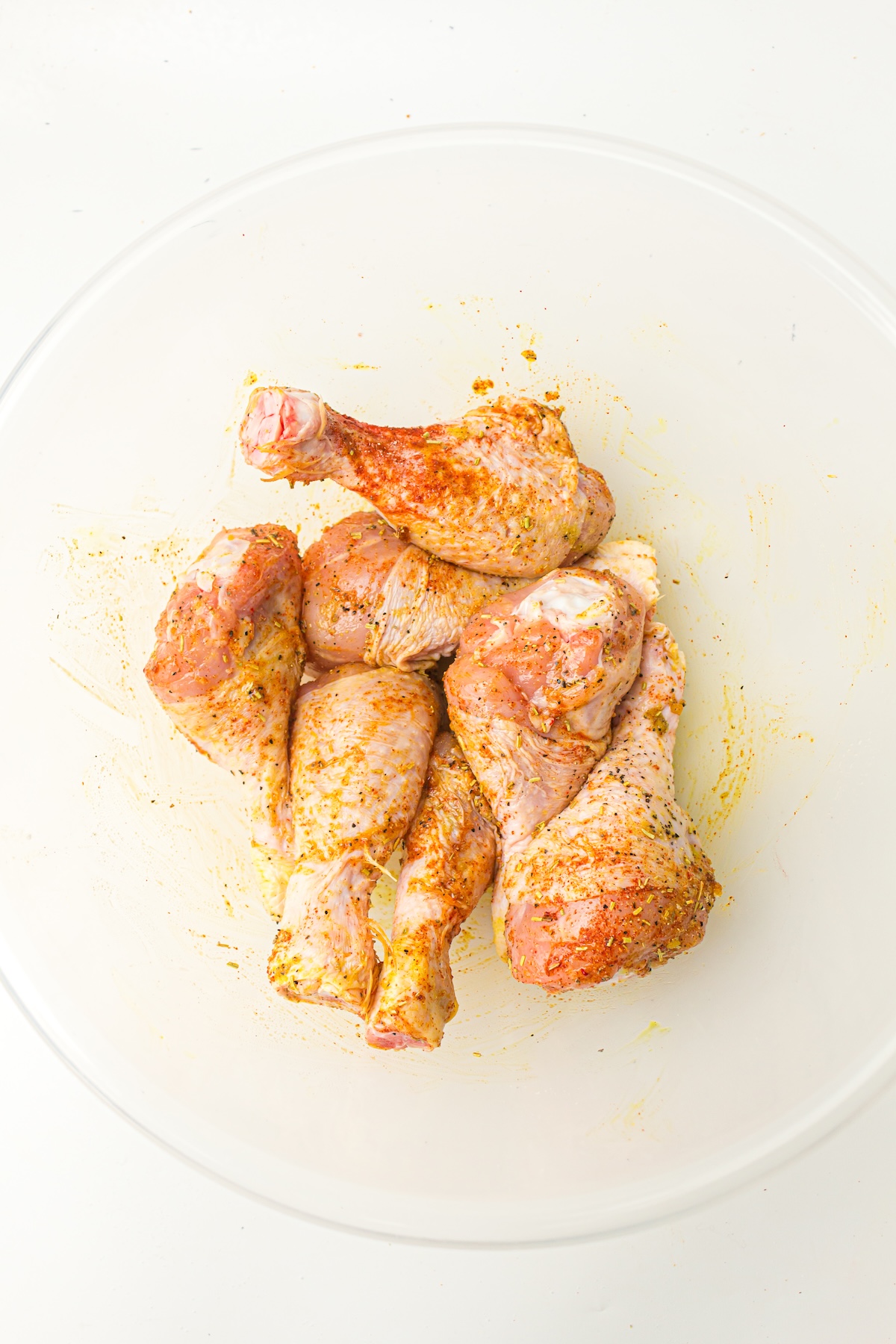 Drizzle the 2 tablespoons of avocado oil over the seasoned chicken. Now, get in there with your hands (or tongs) and toss everything together. Rub the seasoning and oil into the meat to ensure every inch of every drumstick is evenly coated. This oil coating conducts the heat and helps the spices adhere.