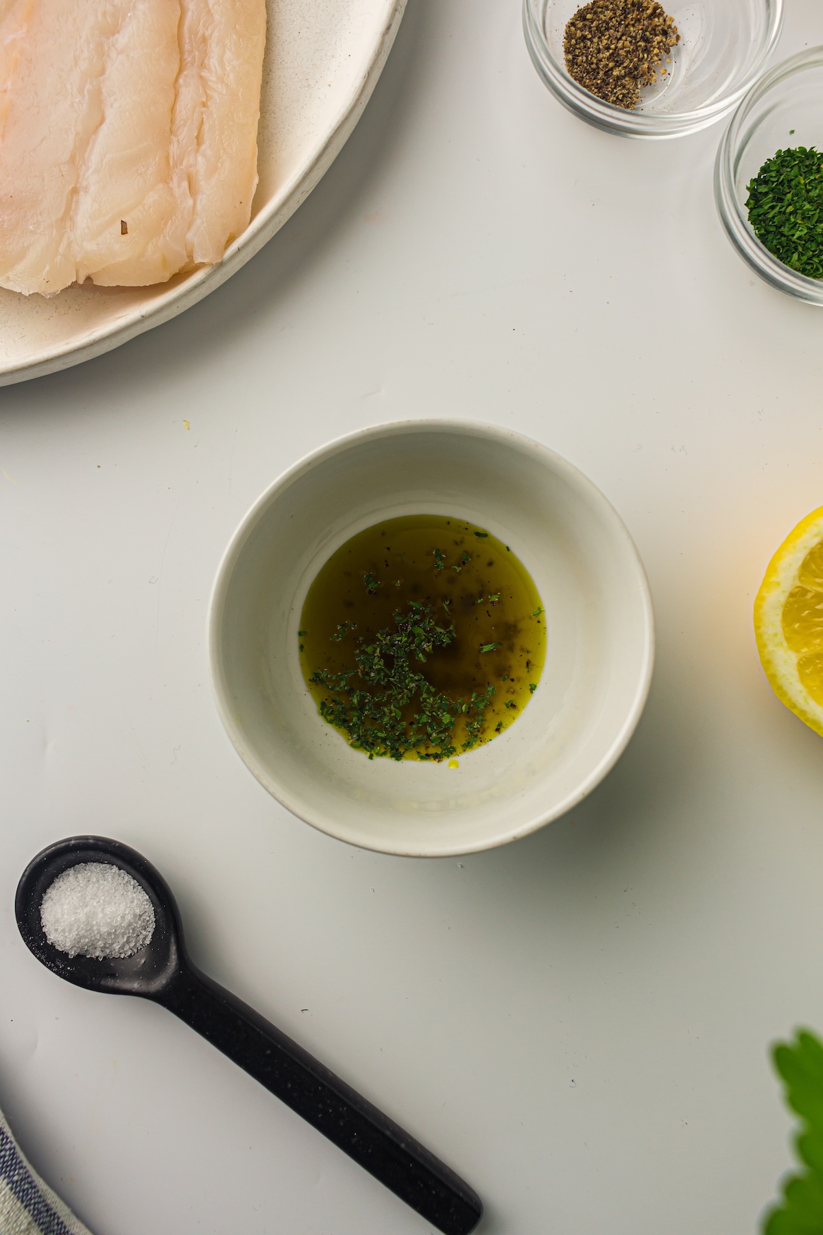 In a small mixing bowl, combine the avocado oil, fresh lemon juice, salt, dried parsley, and black pepper. Give it a good whisk until everything is well combined. This simple mixture will add a bright, savory flavor to the fish.