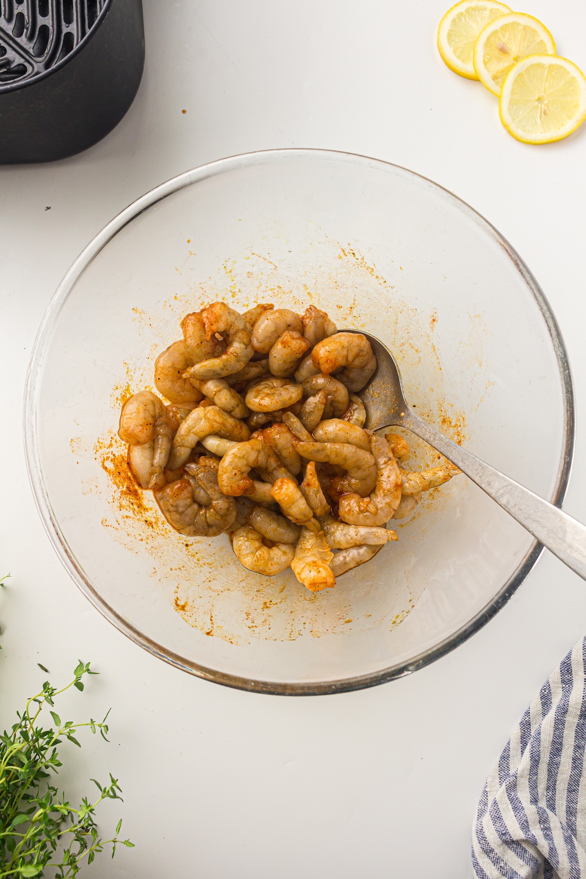 Pat your peeled and deveined shrimp dry with a paper towel. This is a crucial step! Removing excess moisture helps the shrimp sear rather than steam, leading to a much better texture. Add the dry shrimp to the bowl with the seasoning mixture and toss until they are evenly coated. Let them marinate for about 10 minutes while you preheat the air fryer.