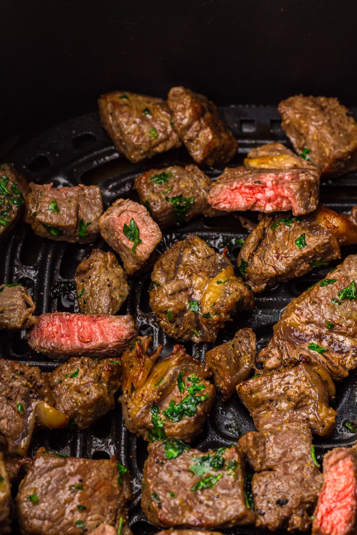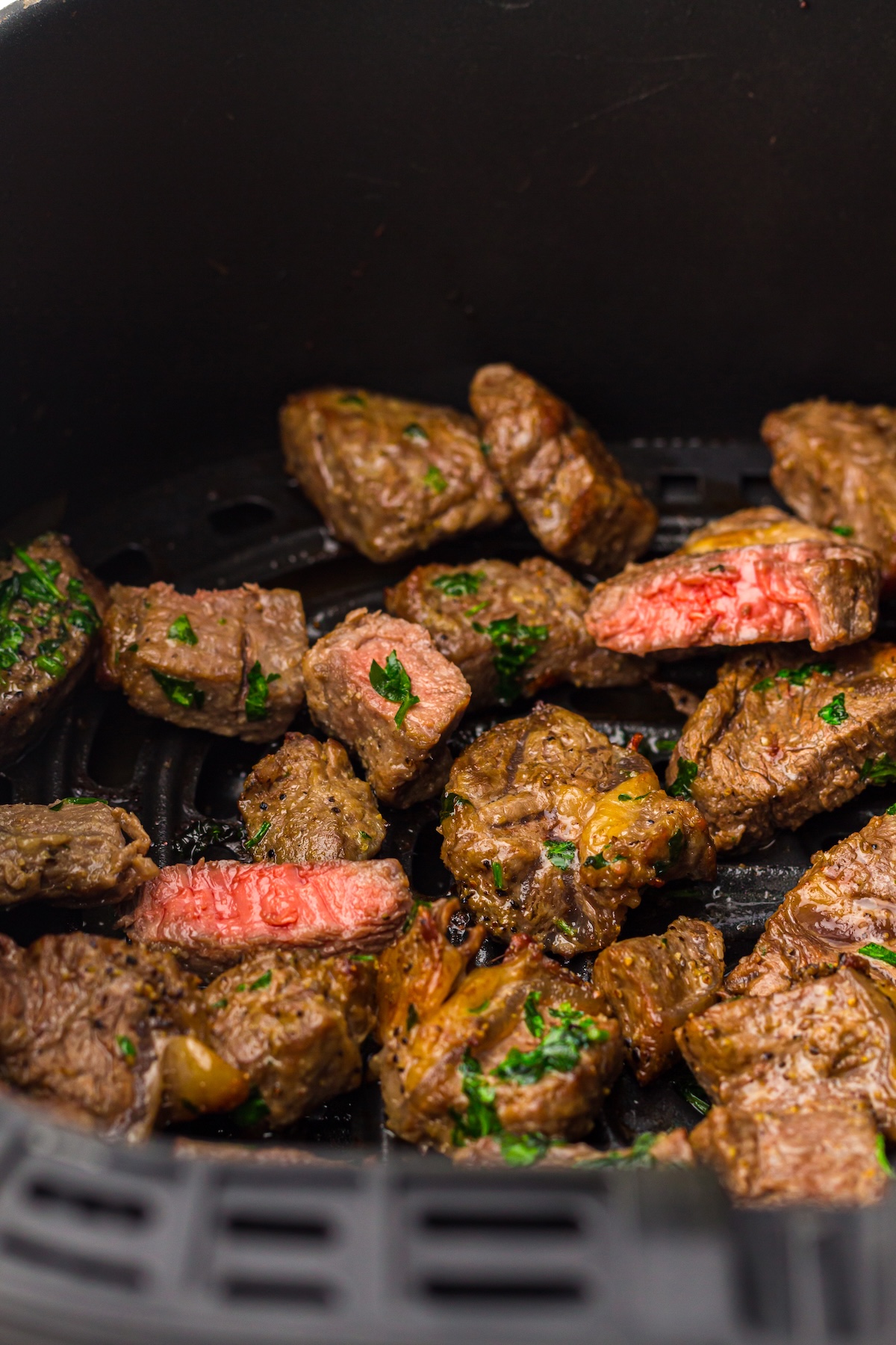Place the basket in the air fryer and cook at 400°F (200°C) for 6-8 minutes for medium-rare to medium, flipping or shaking the basket halfway through. The exact time will depend on the size of your bites and how you like your steak cooked.