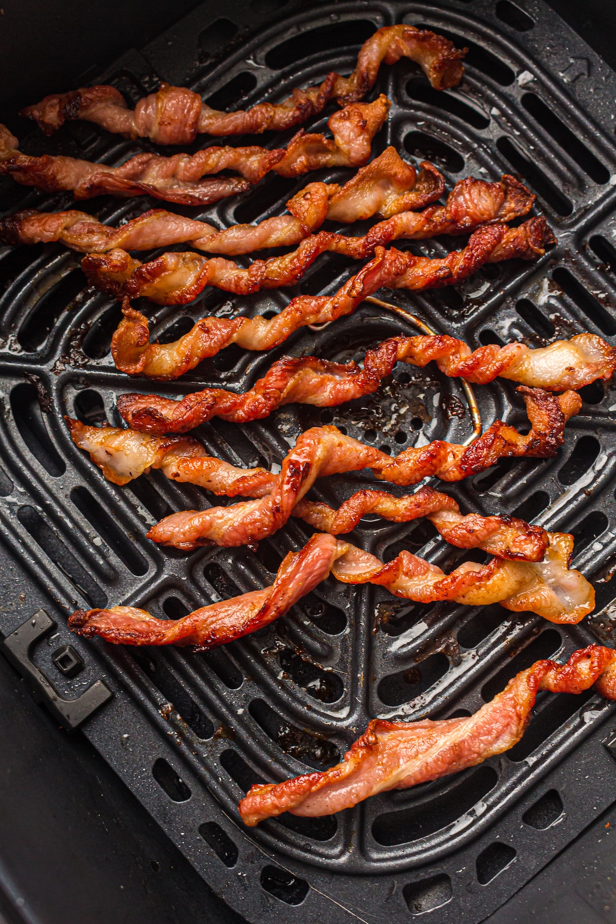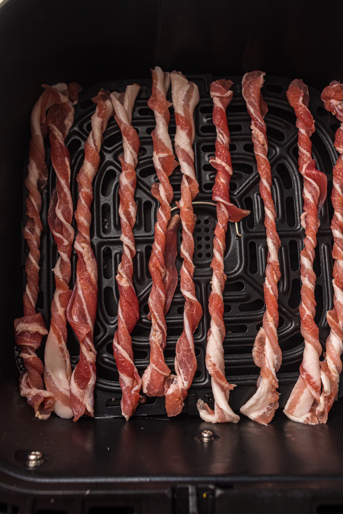 The key is to twist it tightly! When you twist the bacon strip, give it a good, firm spiral from end to end. Placing them snugly in the basket also helps them hold their shape as they cook and shrink.