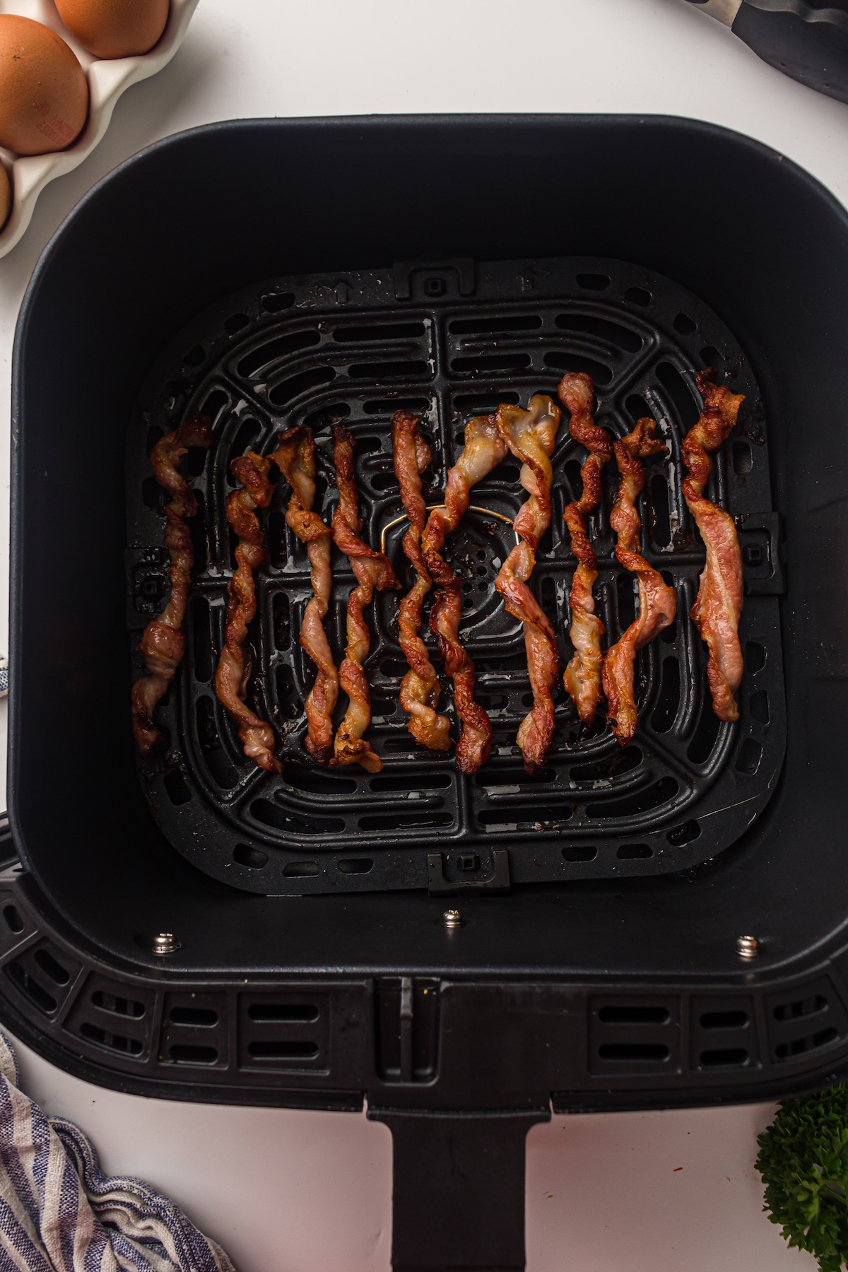 - Cook the bacon in the air fryer at 400°F (200°C) for 5 minutes, or until the bacon reaches your desired level of crispiness.